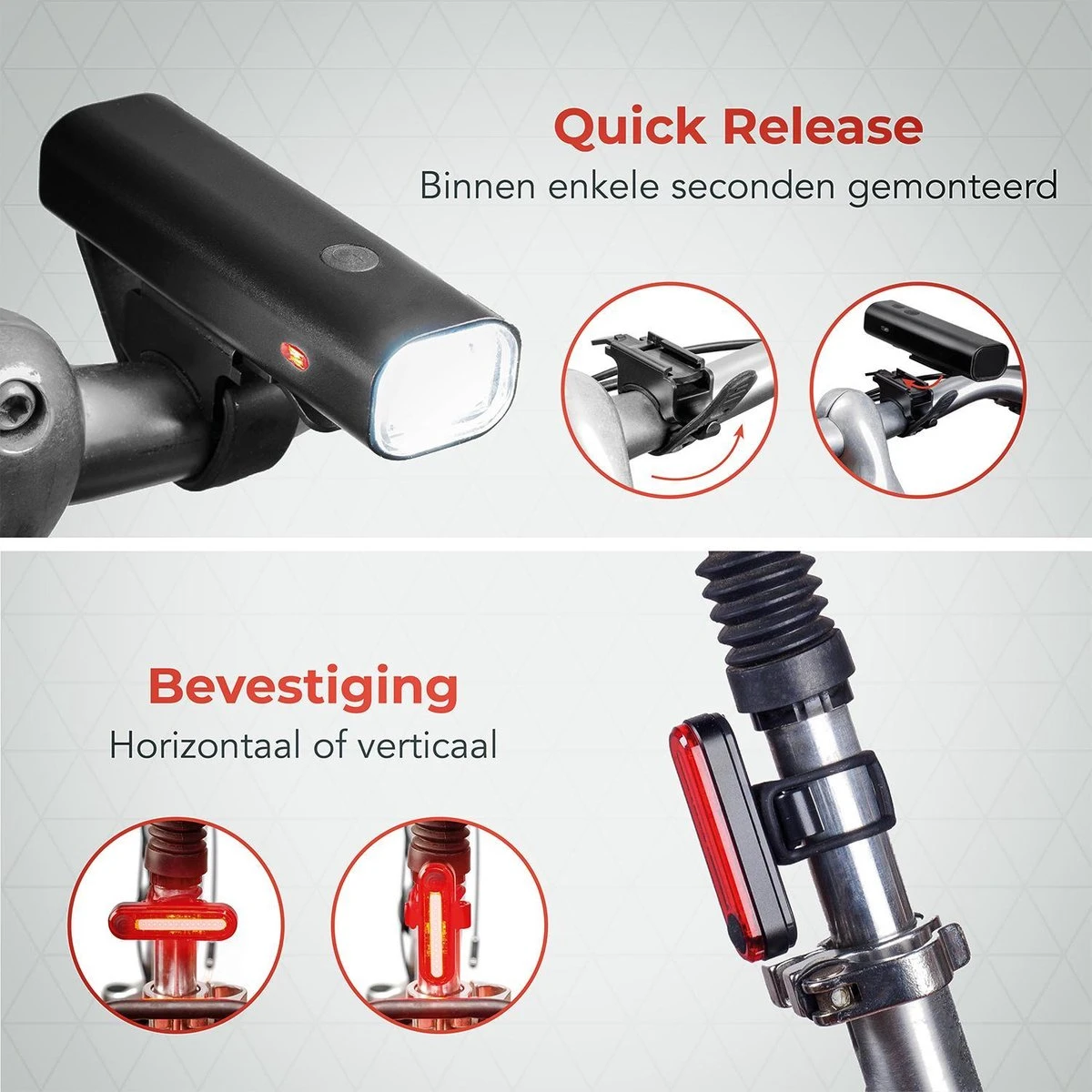 In het donker wil je natuurlijk kunnen zien waar je fietst en zichtbaar zijn in het verkeer. De voorlamp heeft schijnsterkte van maarliefst 400 lumen. Zo ben je niet alleen zichtbaar voor anderen, je ziet zelf ook altijd goed het wegdek. Daarbij zijn beide lampen licht van gewicht, zodat je ze makkelijk mee kan nemen in je tas of jaszak.