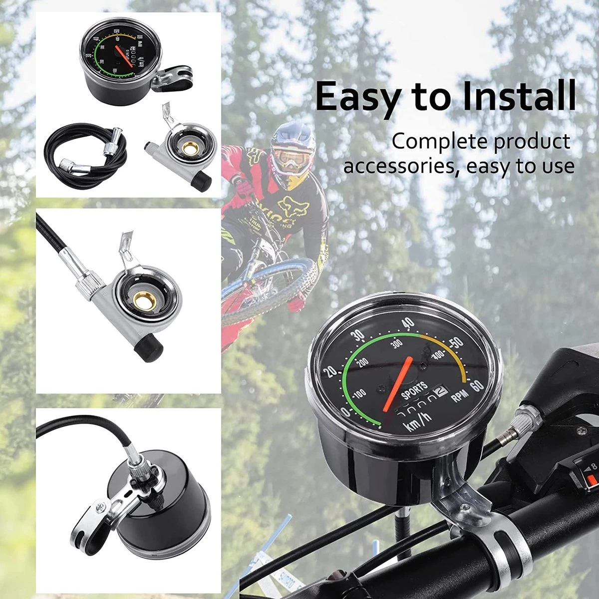 De teller wordt aangedreven door een kabel die verbonden is het as van je voorwiel. Het uiteinde van de worm is aan het meganisme gehaakt en wanneer het wiel draait, begint het wormwiel en de kabel te draaien en laat het mechanisme werken. De teller toont een snelheid tot 60 km/u en het totaal aantal afgelegde kilometers. Terwijl de wijzer van links naar rechts beweegt, moet de montage aan de rechterkant van het wiel worden uitgevoerd.