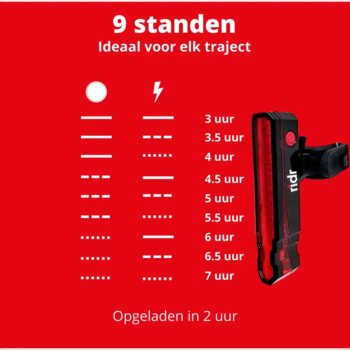 RIDR Lights is een revolutionair 2-in-1 fietslicht. Met 5 sterke LED’s en 2 extra Laser diodes geniet je van maximale zichtbaarheid op de baan. De Laser Lights vormen een dubbel patroon op de grond om auto’s op een veilige afstand te houden en beter zichtbaar te zijn voor het verkeer. Met RIDR Lights neem je je veiligheid in eigen handen!